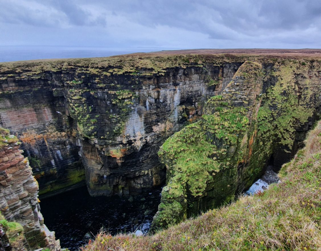 A ‘geo’ derives from Norse, and refers to a typical feature of Caithness geology: a deep ravine in the cliffs, where the sea cuts its way through a narrow cleft in the coastline. At Wifie’s Geo, the rare occurrence of a geo containing a sea stack is a unique sight – a dramatic and awesome place only made better by its remoteness, which gives the sense of visiting somewhere few have been lucky to experience.